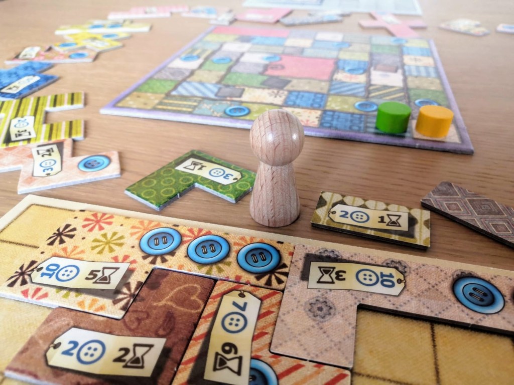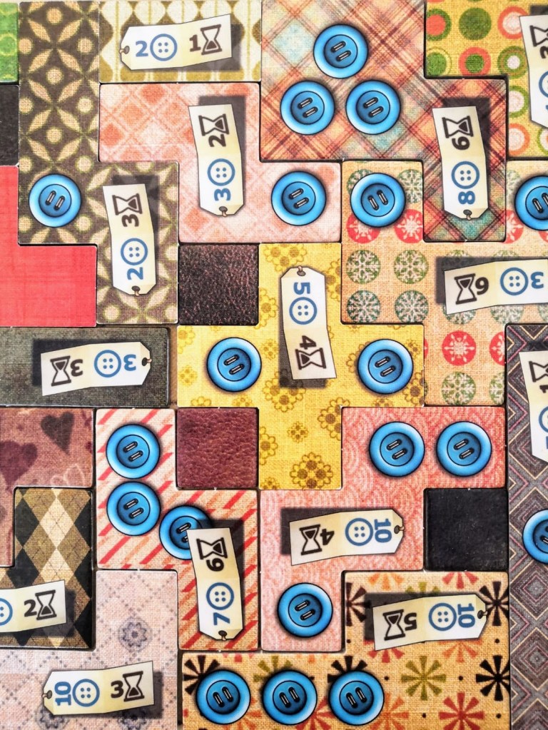 The two tokens follow a path on the central board, with special bonuses triggered when a player’s token passes either a button or leather patch. A button payout awards buttons to a player according to the number of buttons that appear on their quilt, while each leather patch is awarded to the first player to pass it, allowing them to mend a gap in their quilt.