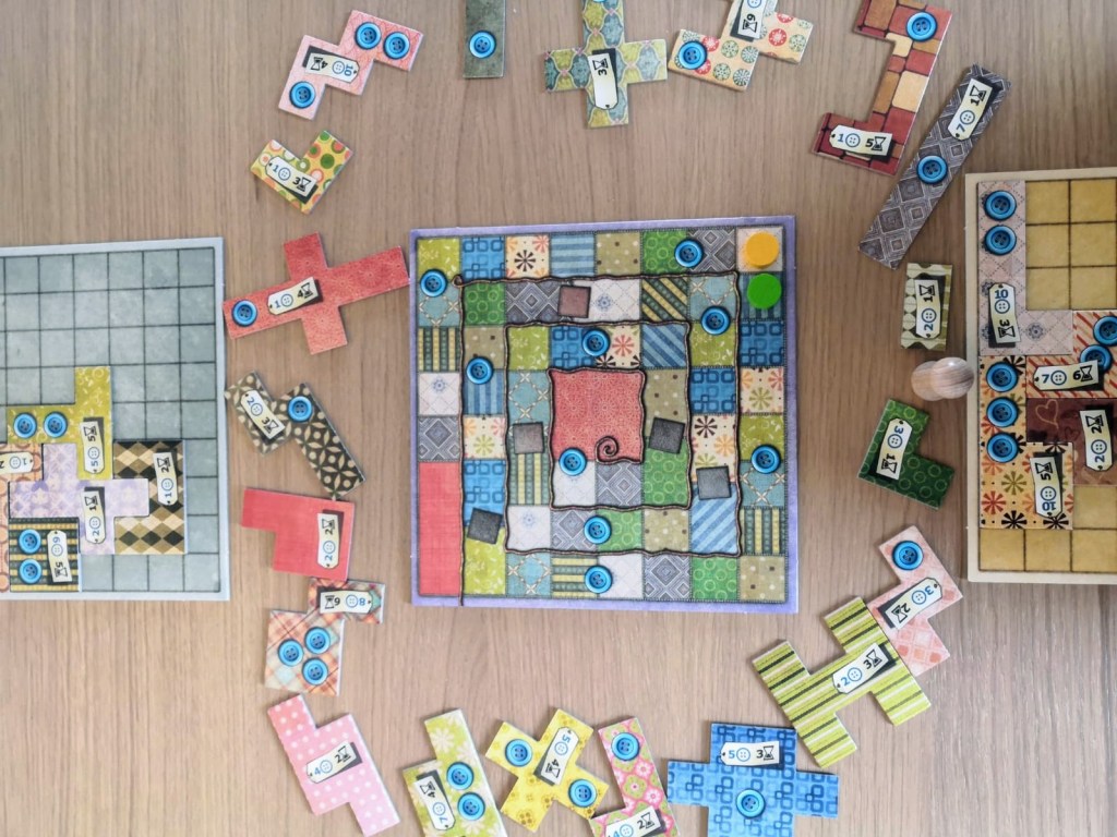 The patches that the players will use to make their quilts are spread in a circle around the central game board and are different shapes and sizes; some may be a bargain in terms of time or buttons but the patch may be an awkward shape to fit in the quilt, while more expensive patches may result in a payout of precious buttons later in the game, making them worth the investment.