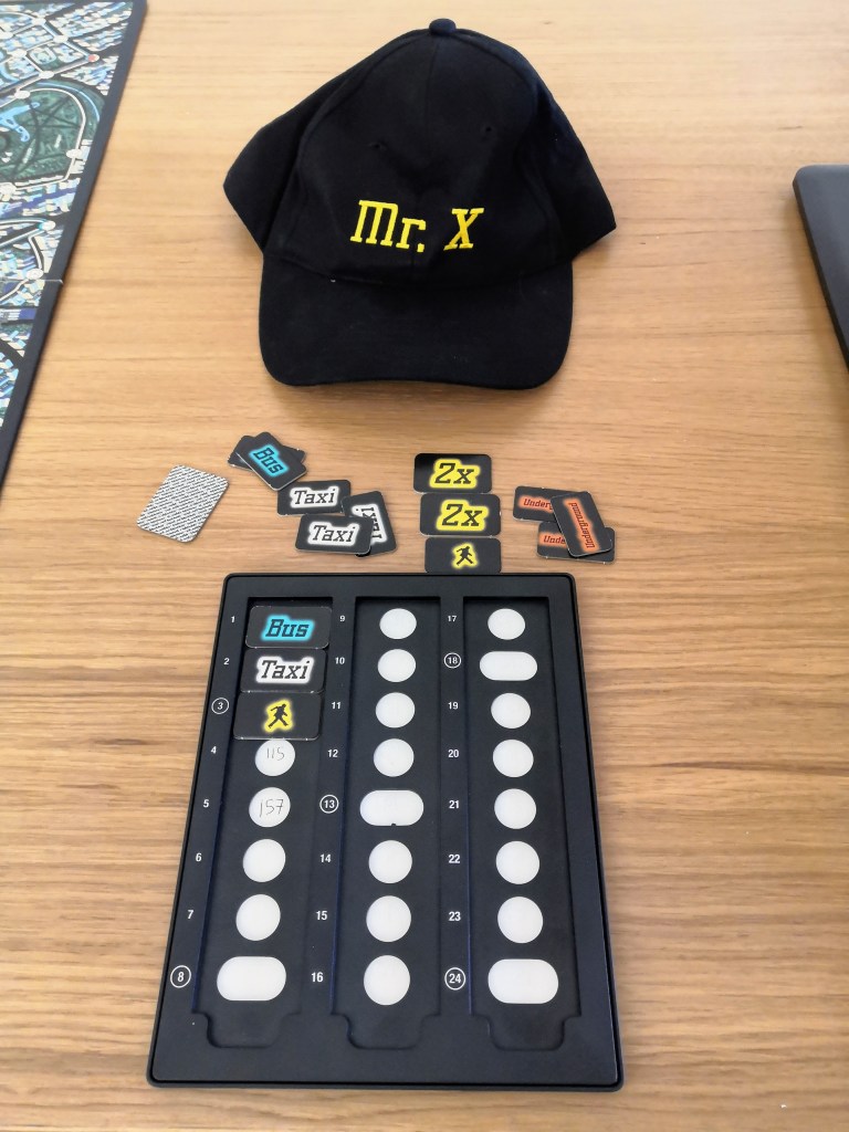 During a turn, the elusive Mr X will travel one stop in secret from his starting location, before writing the number of his destination in his Travel Log and covering it with the type of transport ticket used. The detectives have access to the finished log, giving them a chronological list of Mr X’s transport choices. Play then moves clockwise, as each detective decides where to move by spending an appropriate ticket.