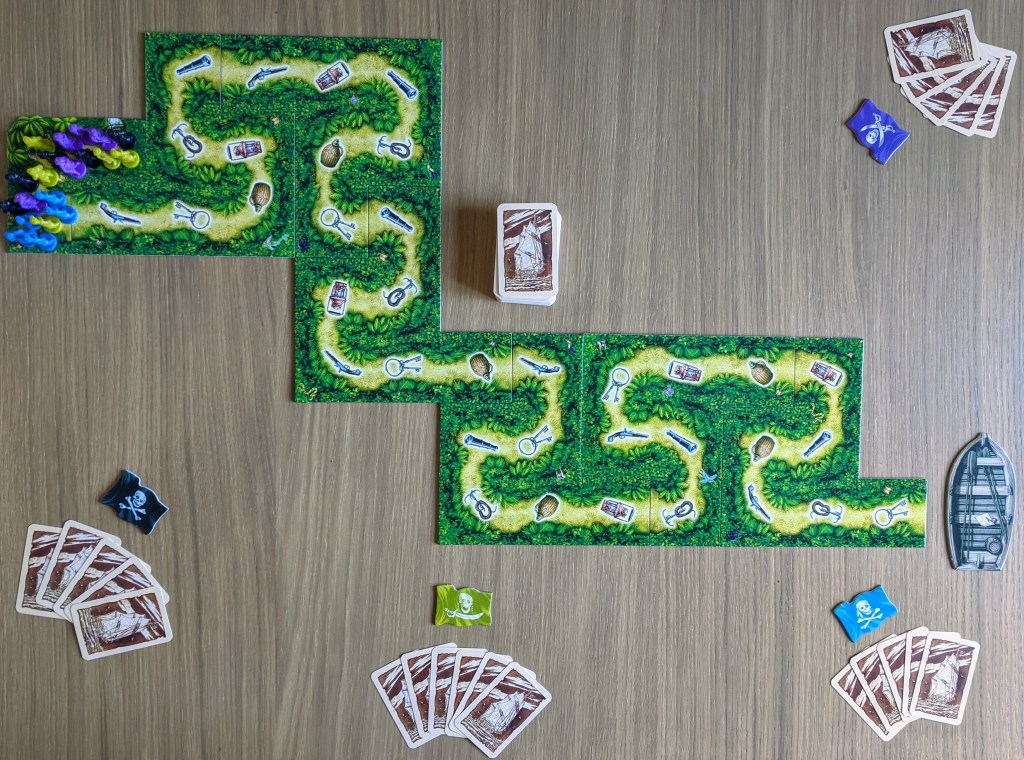 Each player then places their five pirates at the meeting place and is dealt five item cards. The first player picks up one extra card so that they hold six items in their hand.