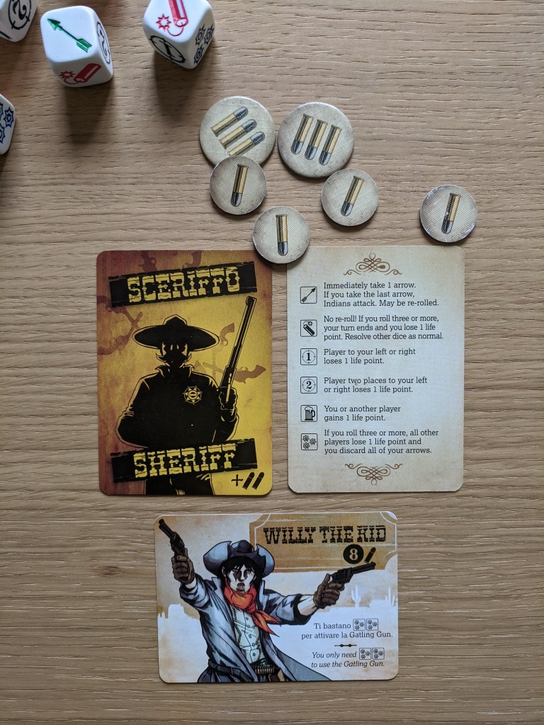The final symbol is a ‘gattling gun’, which only activates if it appears on three or more dice at once. You then remove all arrow cards on your character and deal one damage to every other player. The dice are resolved in a particular order, so, for example you must take any arrow cards before the gatling gun takes effect.