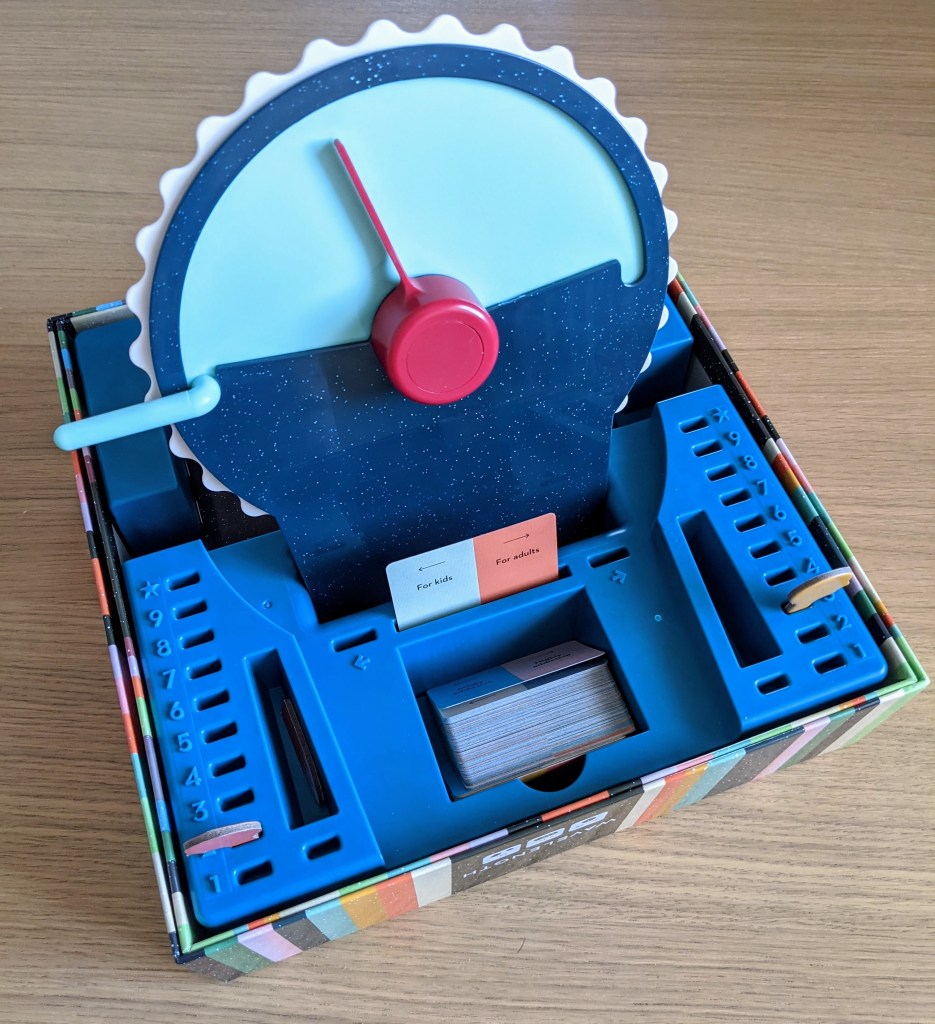 Although the rules can seem a little complicated at first glance, trust us – gameplay is actually quite straightforward! It’s novel how the giant wheel fits neatly into the box, which can be passed around the group.