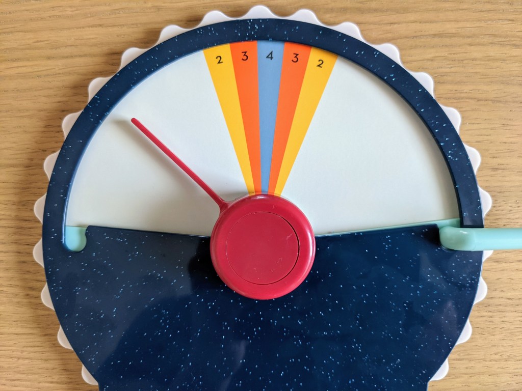 One person on the first team draws a card which will define a scale for the board, such as ‘hot’ to the left and ‘cold’ to the right, or ‘for kids’ on one side and ‘for adults’ on the other. They then place the card at the front of the wheel and set up the spinning device by closing the covering window, spinning the white wheel to randomise the ‘target’ zone, then re-opening the covering window.